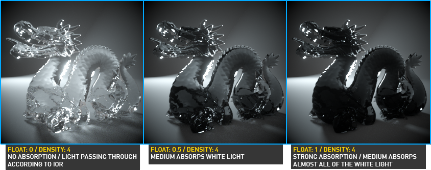 值为 0(黑色)表示无吸收。大于 0 的值表示介质吸收白光的快慢程度。在下图中,展示了不同浮点值产生的吸收结果。请记住,密度值也会被考虑在内。此示例中使用的 FloatTexture 值在 0 到 1