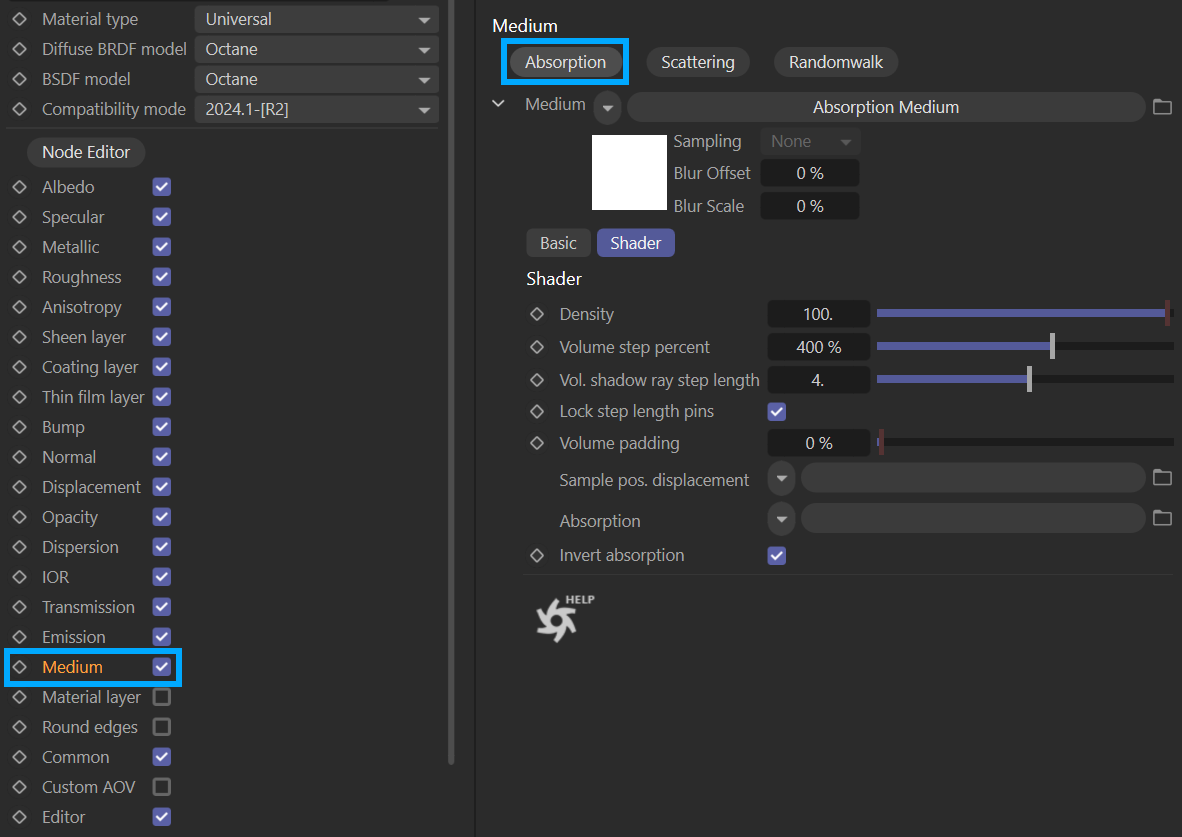 吸收 过程的位置。要将介质添加到 Octane 材质中,请启用 Medium 切换开关,如下所示。当您选择材质的 Medium