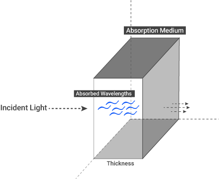 当光线照射到半透明物体或介质上时,光线的能量会传递给该介质,并可能转化为其他形式的能量(如热量);这个过程被称为吸收,它依赖于波长。所有表面都会吸收光线的某些波长。这是由于取决于表面的电子构型能量交换所致。吸收现象与光线、波长、表面特性和表面厚度紧密相关。