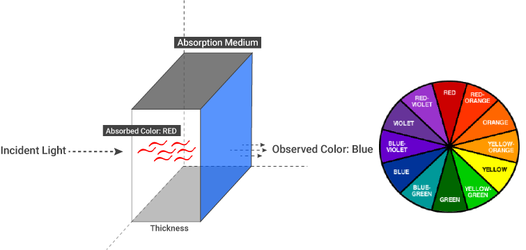 当介质吸收白光的某些波长时,我们看到剩余波长为颜色。当介质吸收特定颜色的光时,我们感知到的物体是互补色,即与吸收颜色相反的颜色。您可以从下面的色轮中看到主要颜色和互补色。例如,当介质吸收红色时,我们看到的颜色是绿色。