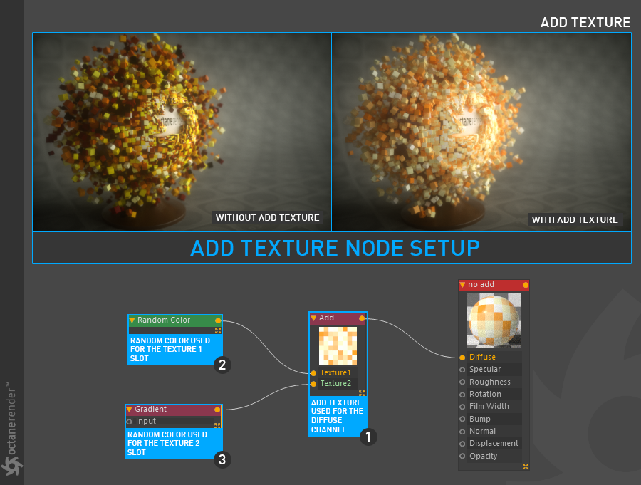 Add Texture 节点将两个纹理相加。该计算类似于 Photoshop 中用于将两个图层的颜色值相加的"添加"图层模式。