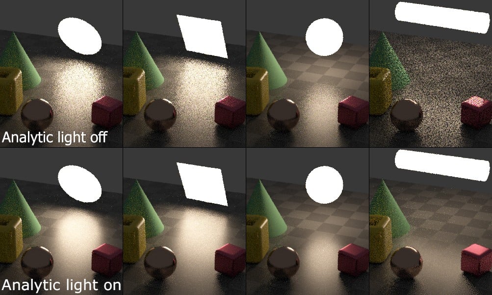 这些基元类似于网格灯光,但具有自定义的低噪点灯光采样。下面的所有图像都是每像素 4 个样本(SPP):
