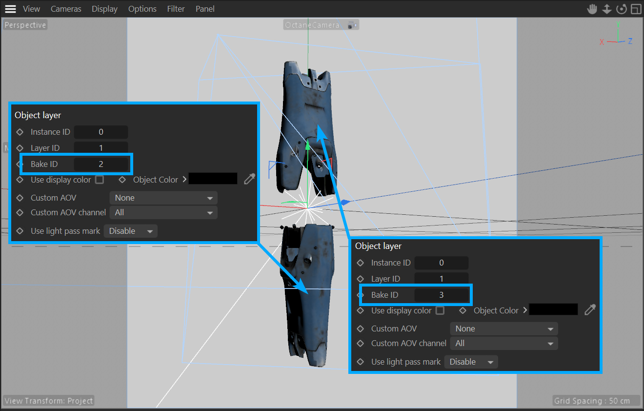 指定应烘焙哪个组 ID。默认情况下,所有对象都属于默认烘焙组编号 1。如果您没有从 Octane Object tag / Object layer 菜单为场景中的对象定义 Bake ID,整个场景的 bake ID 将默认为 1,并将烘焙整个场景。