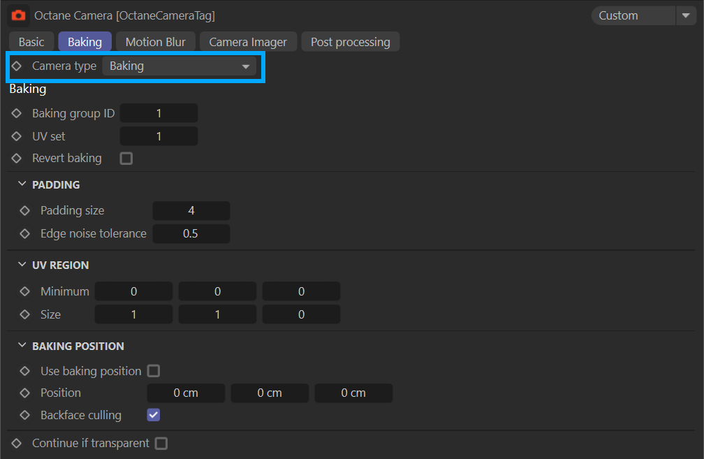 启用时,使用用于烘焙"位置相关"伪影的位置。位置是用于"位置相关"伪影(如反射等)的相机位置。背面剔除确定是否烘焙背面几何体。