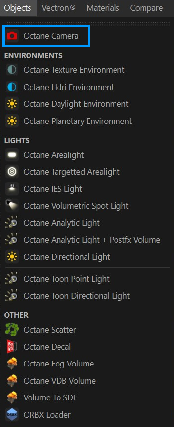 使用 实时查看器 > 对象 > Octane 相机 菜单项创建 Octane 相机。当您选择此选项时,Octane