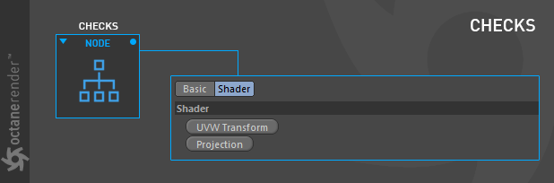 Checks 程序纹理可用于制作条纹、棋盘格和网格图案。参数包括 UVW transform 和投影输入。