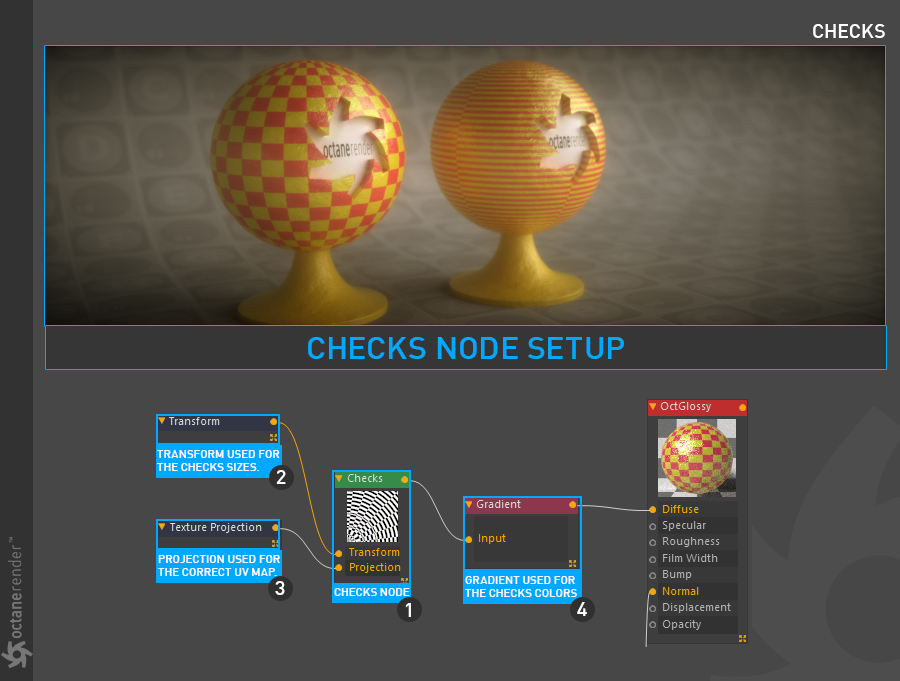 纹理投影节点用于根据几何体定义棋盘格纹理的 UV 贴图坐标。投影纹理节点在 此 部分中描述。
