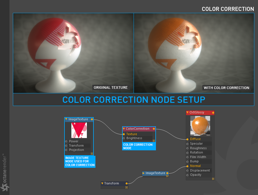 颜色校正节点用于调整图像贴图的属性,如亮度、色相、饱和度、gamma 和对比度。