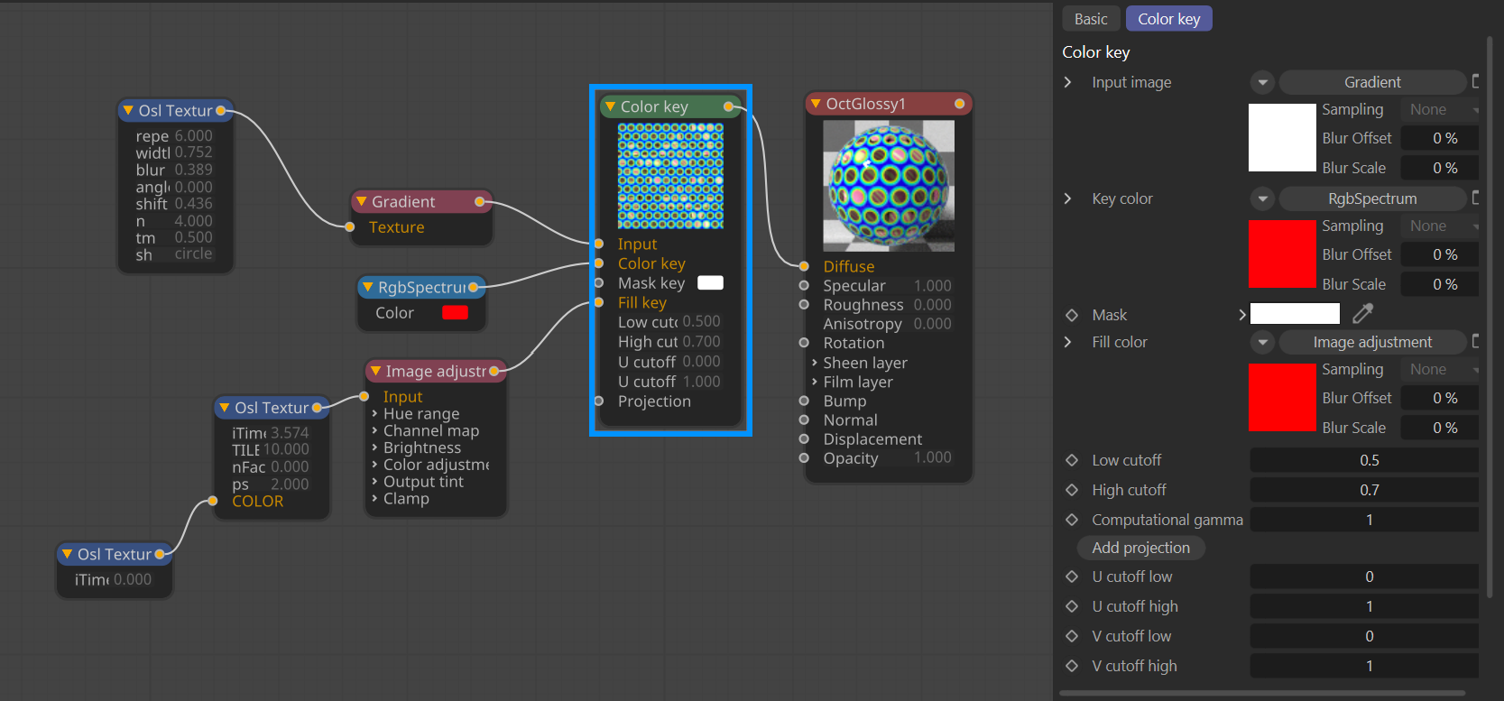颜色键控 节点用于键控出连接的纹理贴图中的指定颜色。插图显示了一个 OSL 圆圈着色器被用作材质的漫反射颜色,着色器的红色部分被颜色键控节点移除,并用 OSL 条纹着色器替换。