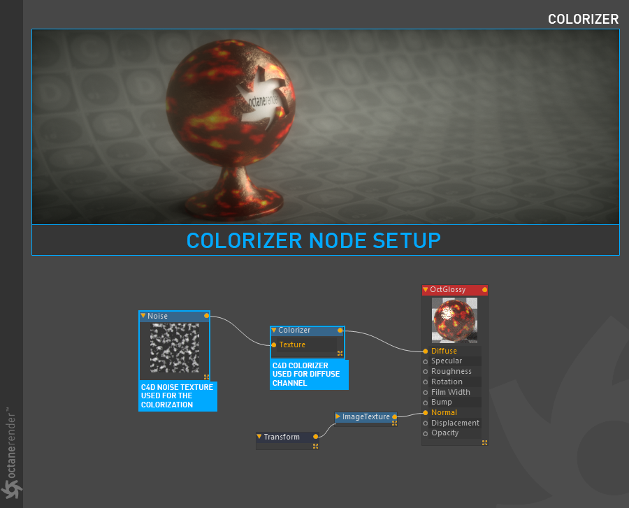 打开节点编辑器并按照下图准备设置。在这里,Cinema 4D 的原生着色器工具(着色器和噪点)都连接到材质的漫反射通道。使用着色器节点,您不能使用来自 Octane 的任何其他程序纹理工具,除了"图像纹理"节点。但是,您可以使用 Cinema 4D 的所有程序着色器/纹理工具进行着色。例如,在下面的示例中,我们使用了 Cinema 4D 的噪点而不是 Octane 自己的噪点。