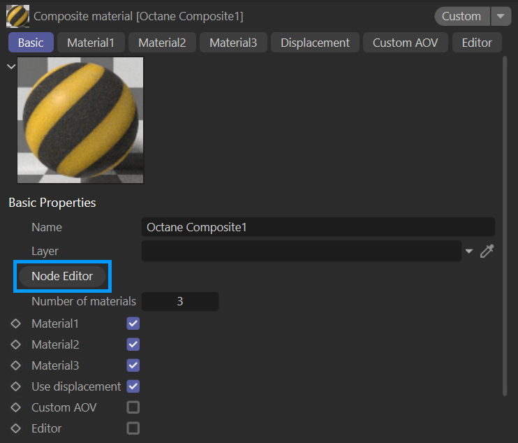 在实时查看器的材质菜单中选择“合成材质”,即可在 Cinema 4D 材质管理器中新建合成材质。编辑时,在属性面板点击节点编辑器按钮。