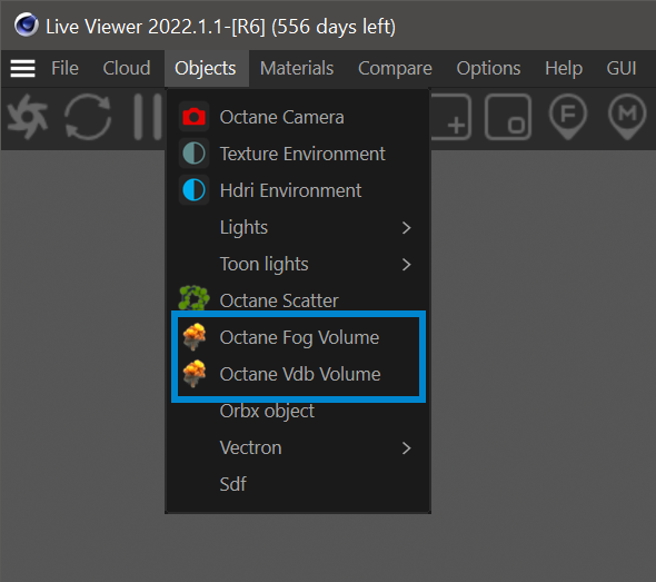 要在 OctaneRender® 中创建体积对象,请从实时查看器菜单中选择 对象 > Octane 雾体积 或 VBD 体积。