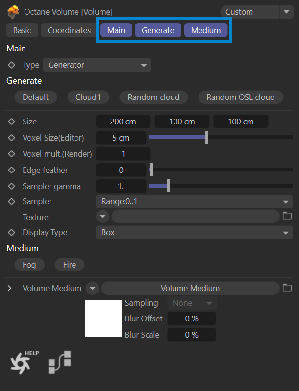 创建体积后,以下面板将显示在 Cinema 4D 属性管理器中。该面板分为 5 个标签,前两个标签是经典的 Cinema 4D 标签。其余 3 个标签是体积特定的。显示的标签集由类型下拉菜单中的设置决定。