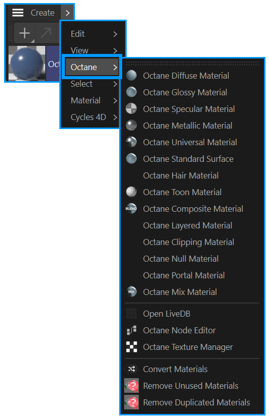 第二种方法是使用 Cinema 4D 材质管理器。从此管理器,您可以从 创建 > Octane 创建材质。