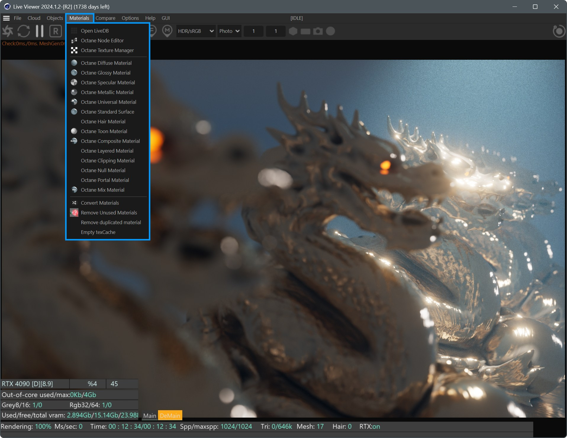 第三种方法是使用 Octane 节点编辑器。为此,请转到实时查看器窗口中的 实时查看器 > 材质 菜单,然后选择 Octane 节点编辑器。
