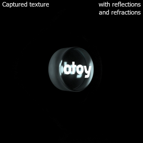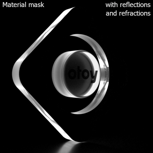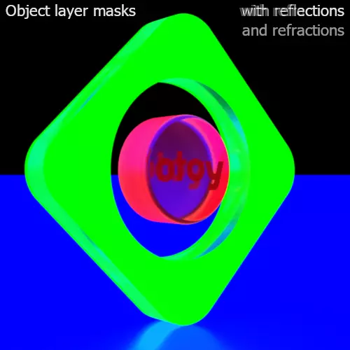 您可以在下面看到主 AOV 和自定义 AOV 1、2 和 4,使用不同的可见性选项渲染。平面和两个对象的对象层分别记录在自定义 AOV 1 的红色、绿色和蓝色通道中。玻璃 材质的蒙版记录在自定义 AOV 2 的 RGB 通道中。自定义 AOV 4 显示内圆柱体漫反射层的捕获不透明度纹理。