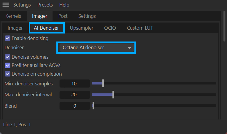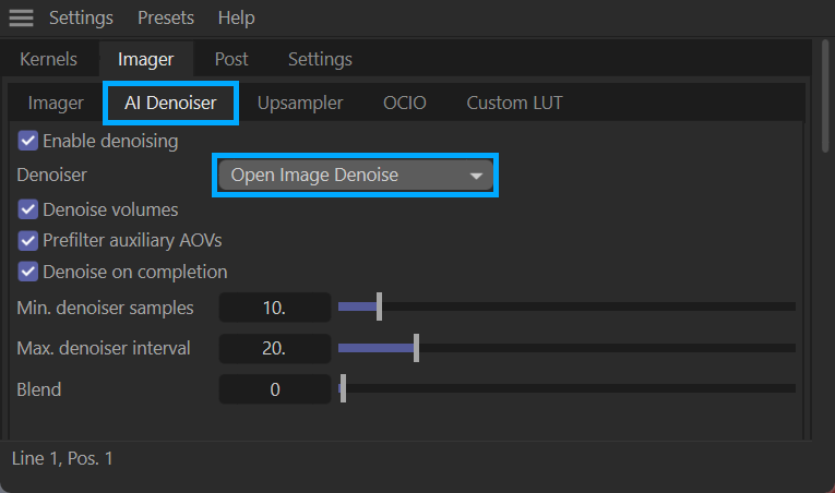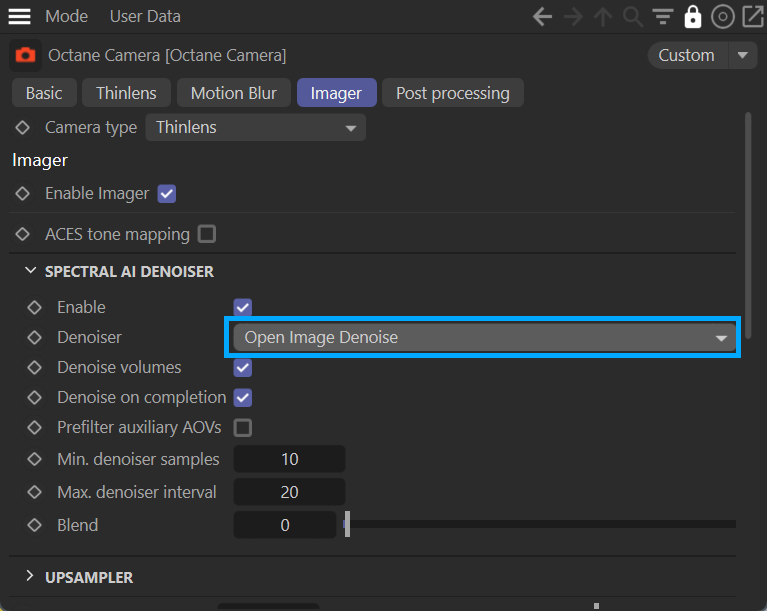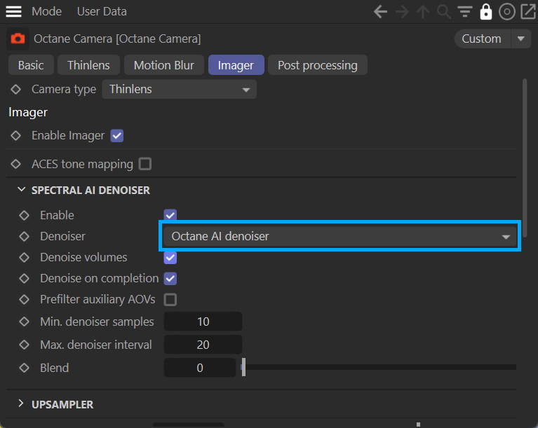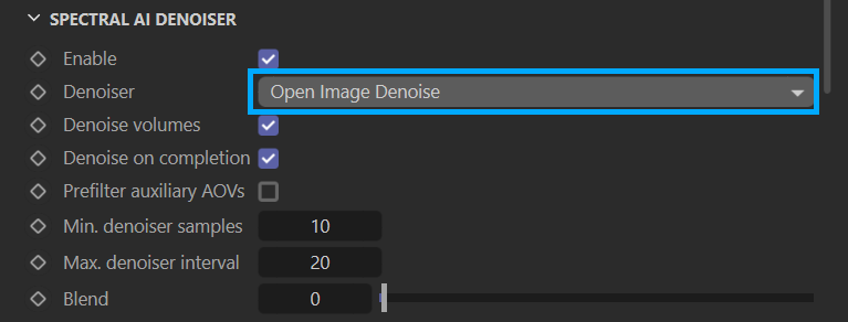 - - 转到 Octane 相机标签 > 相机成像器标签 > 光谱 AI 降噪器组 并 启用。