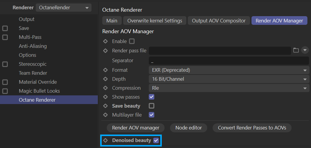 - - 进入渲染设置(CTRL + B)并转到 渲染设置 > Octane 渲染器 > 渲染 AOV 管理器标签。启用 降噪美丽通道。如果还需要标准美丽通道,请在此处启用它。如果场景中存在体积。如果需要,启用 "降噪体积"。