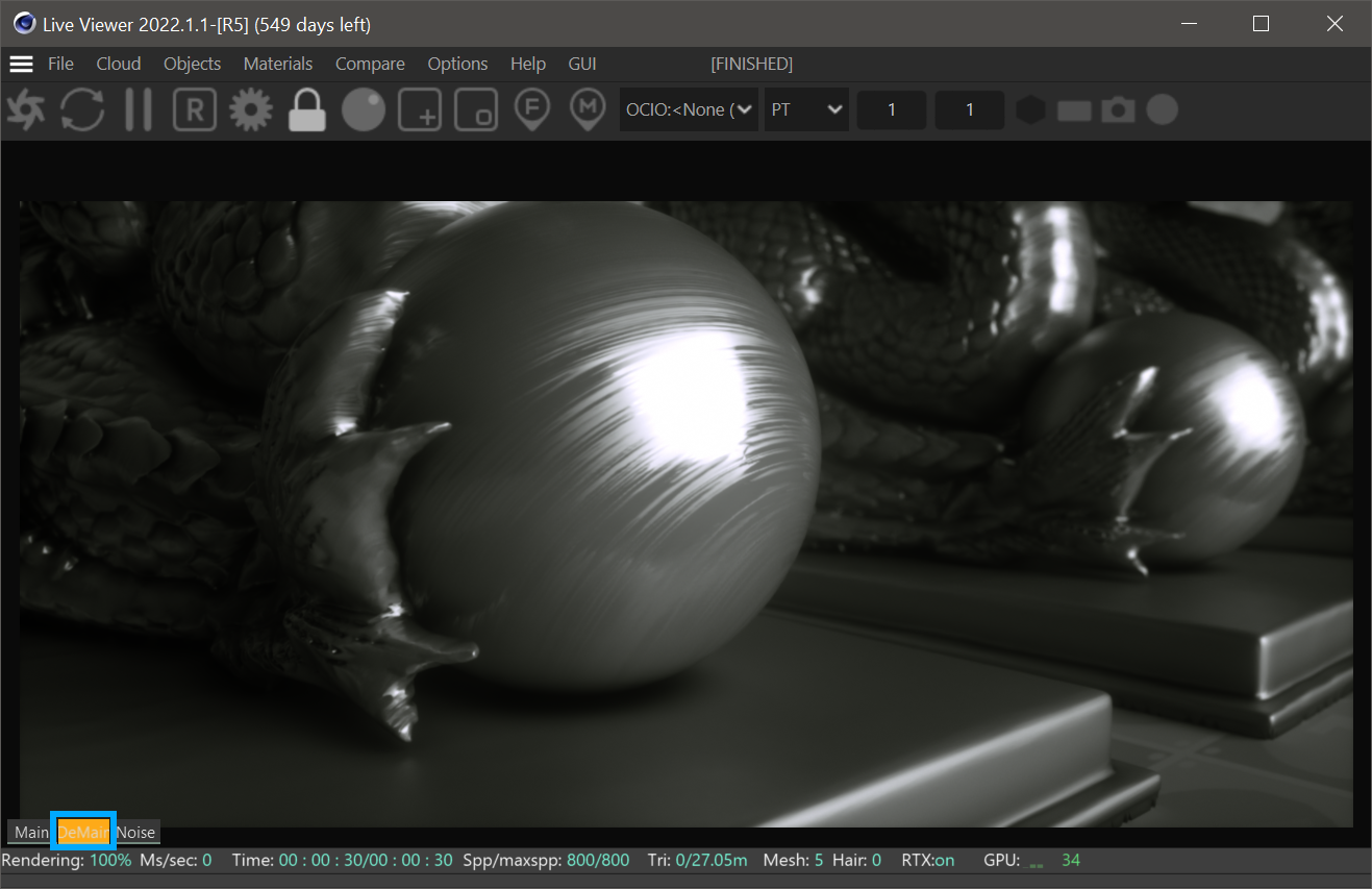 当降噪激活时,实时查看器将在实时查看器窗口的左下角显示两个名为"主"和"降噪主"的按钮。"主"按钮显示活动渲染。"降噪主"按钮显示降噪渲染。如果激活了"完成时降噪"选项,结果在渲染完成之前不会准确。要查看与主通道同步的 AI 降噪器,请禁用"完成时降噪"。