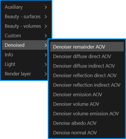 - - 单独地,可以通过从 渲染设置 > Octane 渲染器 > 渲染 AOV 管理器 > 渲染 AOV 折叠菜单中选择所需的 AOV 输出并按下 添加渲染 AOV 按钮来激活各种降噪 AOV 通道,这会显示此菜单: