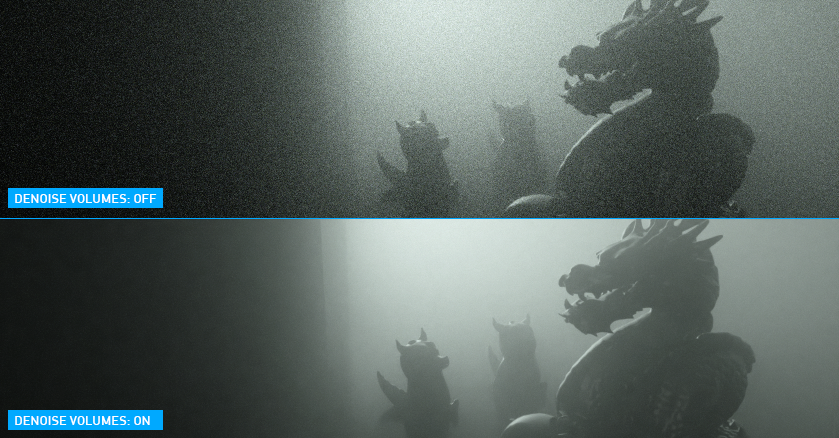 重要 体积通道具有非常低频率的细节,因此不要使用少于 1000 采样 的体积 AI 降噪器,以便保留最终渲染质量的细节,这将类似于场景的 2K 到 10K 采样渲染
