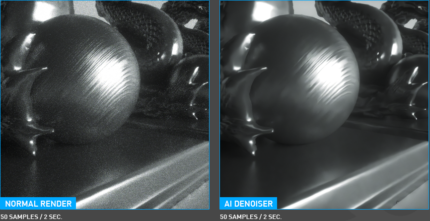 AI 降噪器的目标是达到接近"目标渲染"的质量,但渲染时间更少。如前所述,使用 AI 降噪器可实现的结果质量取决于有足够的采样来确保良好的结果。下面的图像显示了正常渲染的输出,有 50 采样,在两秒内渲染。请注意图像中的噪点量是显著的。右侧的图像使用 AI 降噪器渲染,花费相同的时间,两秒。请注意丢失了多少细节,并被大块斑点区域取代。此图像的采样量太低。