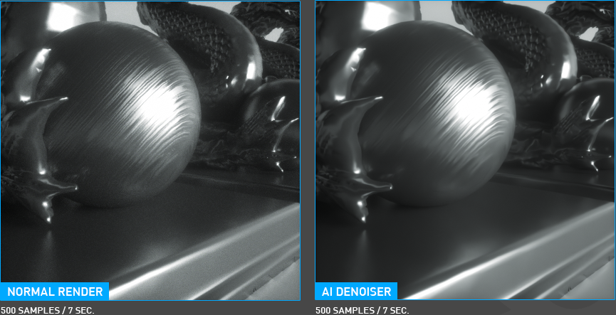 下面的两个图像将提供使用 AI 降噪器的上下文。左侧是快速渲染,只有 250 采样。结果对于实时外观开发和照明是足够的,但仅此而已。右侧的图像要好得多,使用了 2500 采样渲染 — 是十倍之多。我们将右侧的图像称为"目标渲染"。