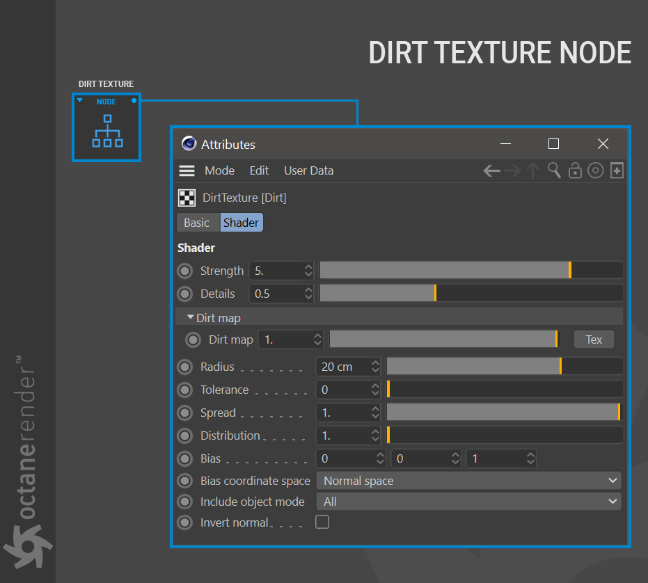 方法来控制污垢光线的分布,这提供了比原始污垢节点更好的外观。此方法允许您控制污垢光线在倒置圆锥内的采样和分布方式(圆锥的顶点是表面上要着色的点),其结果可以进一步通过纹理输入和以下部分中描述的控件进行调制,以真正精细调整结果以获得更真实的外观。