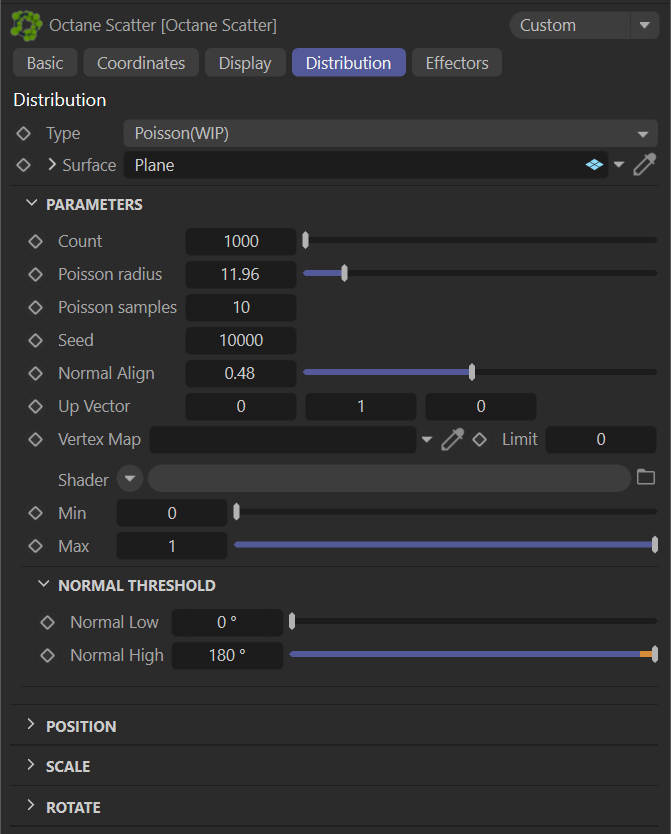 重要注意 不要在此字段中使用 Octane 纹理(例如 Octane 噪点、湍流),因为所有纹理类型在 Octane 中都是 GPU 着色器 — Octane 散布对象旨在仅与 CPU 着色器一起工作。