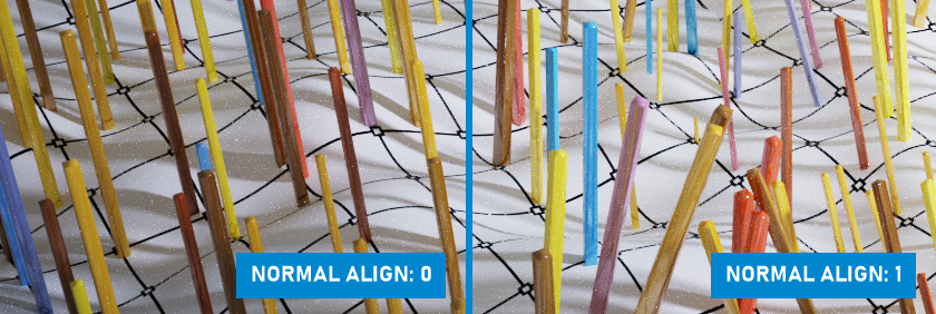 将法线对齐设置为 0 后,尝试调整上向量。上向量需要三个值,X、Y 和 Z 各一个。当您将法线对齐设置为 0 时,您从计算中排除了法线对齐。现在问题是哪个轴将产生所需的结果。将第一个值设置为 1,同时将其他值保留为 0。如果这不起作用,请将下一个值设置为 1,同时将前一个值重置为 0,依此类推。这三个值之一将起作用。根据需要调整法线对齐滑块以进行小幅调整。