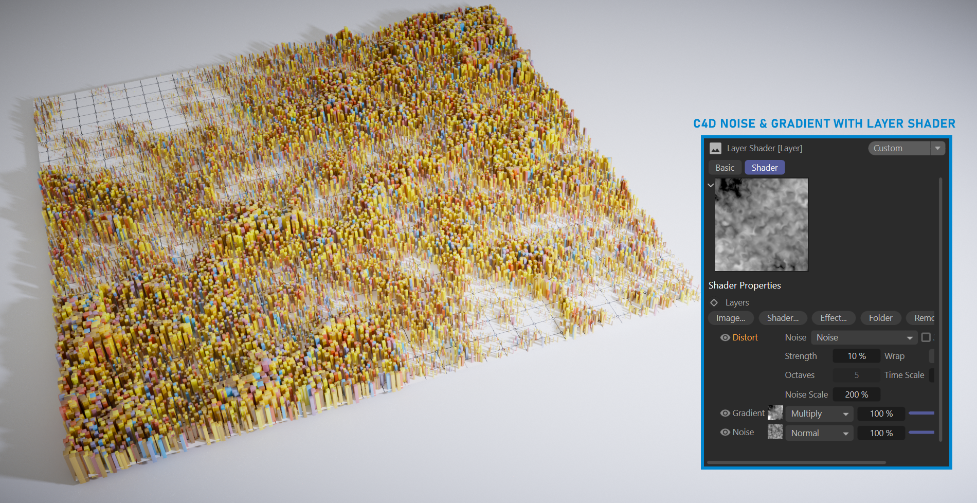 通过着色器插槽分配首选的 Cinema 4D 程序纹理。在下面的图示中,在 C4D 图层着色器中使用了噪点和渐变。最小和最大值可用于调整分布。