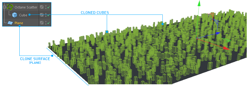 要使用 Octane 散布,创建 Octane 散布对象,将要散布的对象设置为层次结构,如下面的图示所示。按照以下部分中的讨论调整 分布 标签中的设置。以下注意事项适用: