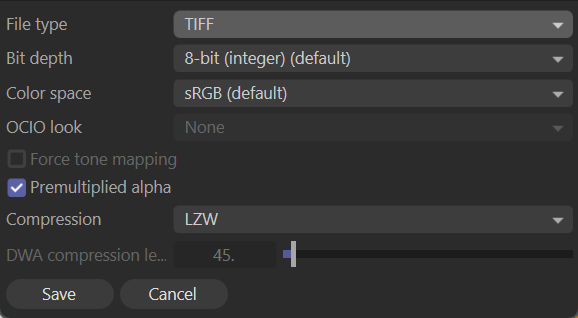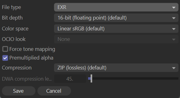 以 EXR 格式保存实时查看器渲染通道。为此,"渲染通道"选项必须在 渲染设置 > OctaneRender > 渲染 AOV 管理器 标签中处于活动状态。
