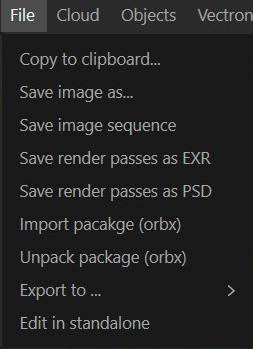 文件菜单 用于以多种图片格式保存实时查看器图像,导出或导入独立版文件,或仅在 Octane 独立版应用程序中编辑文件。