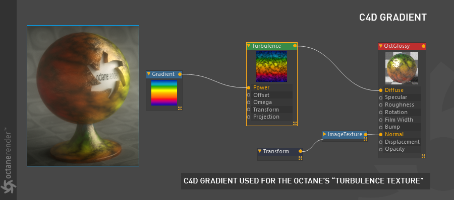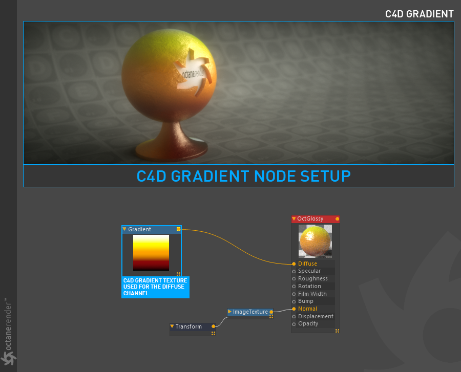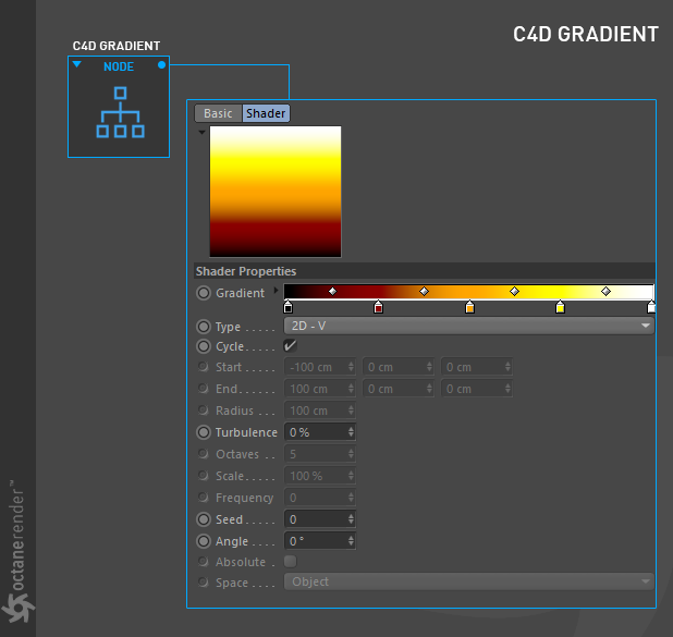 C4D 渐变节点用于使用 Cinema 4D 的"渐变"着色器。不应将其与 Octane 渐变节点混淆,因为每个节点都有不同的功能。Octane 的渐变纹理节点在 这里 描述。您可以在 Cinema 4D 帮助文件中阅读 C4D 渐变着色器是什么以及它的作用,或者您可以访问 此 链接以获取更多信息。