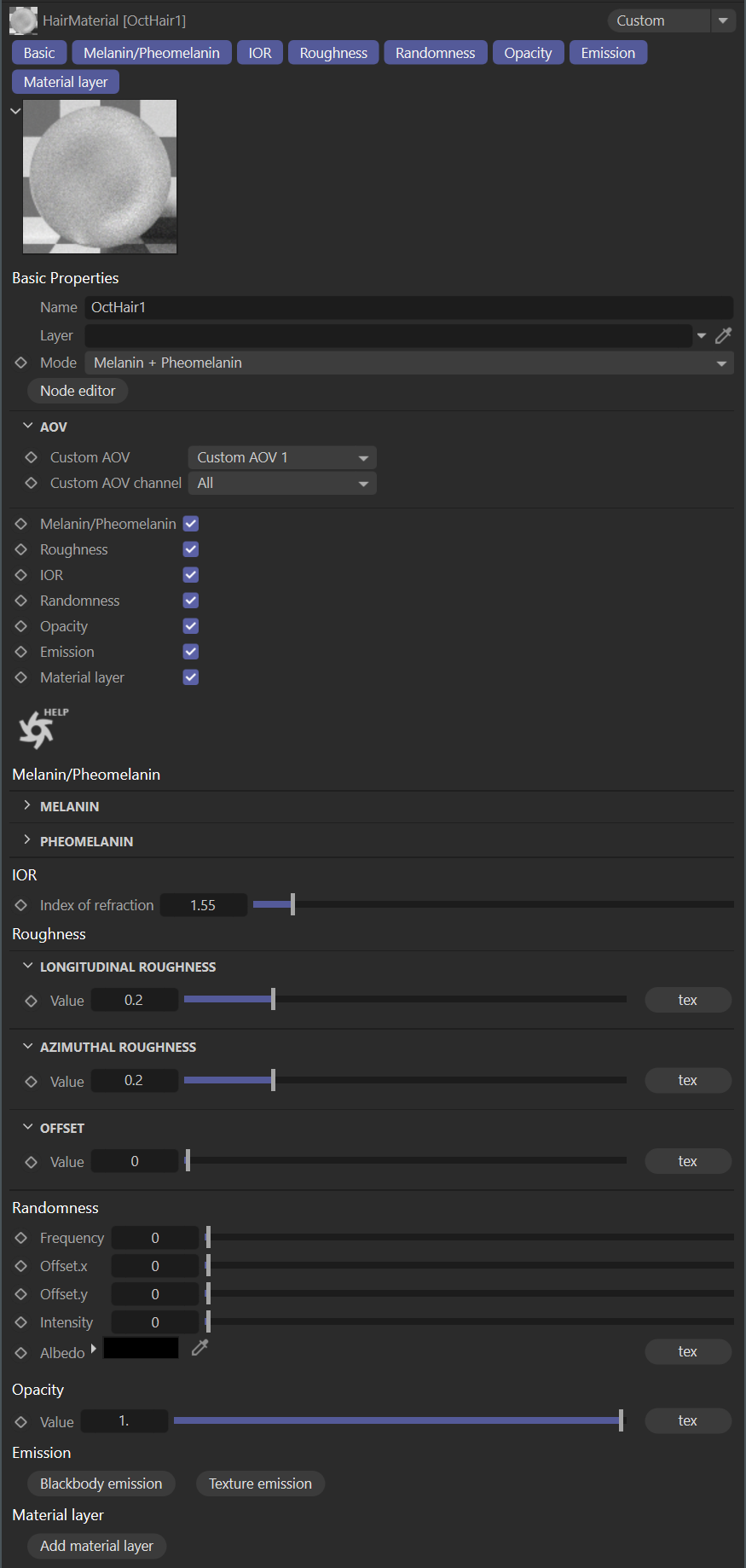 头发材质有其独特的参数集,允许头发的反照率和黑色素 + 褐黑色素着色方法,以及用于沿着头发丝的 different 散射行为的多个粗糙度参数。反照率模式比黑色素 + 褐黑色素更适合人造头发纤维,后者更适合天然头发纤维。下面的图示显示了头发材质节点,每种模式设置分别呈现。