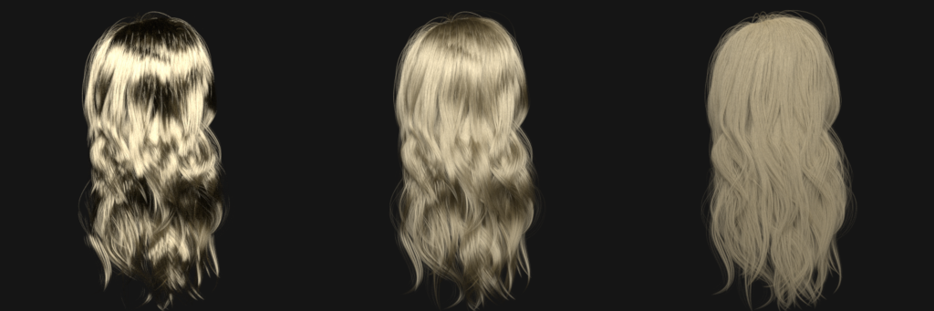 纵向粗糙度定义沿着头发丝的粗糙度,此值越高,沿着丝的散射越多(这称为纵向散射),头发丝看起来越粗糙。另一方面,此值越低,头发丝看起来越有光泽,如下面的图像 所示,纵向粗糙度从低(左)到高(右)变化: