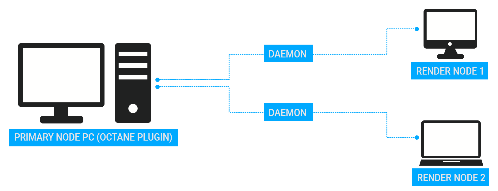 上面的图示显示了一台主节点 PC 和两台渲染节点计算机。我们希望使用这两台渲染节点及其安装的 GPU 进行渲染。