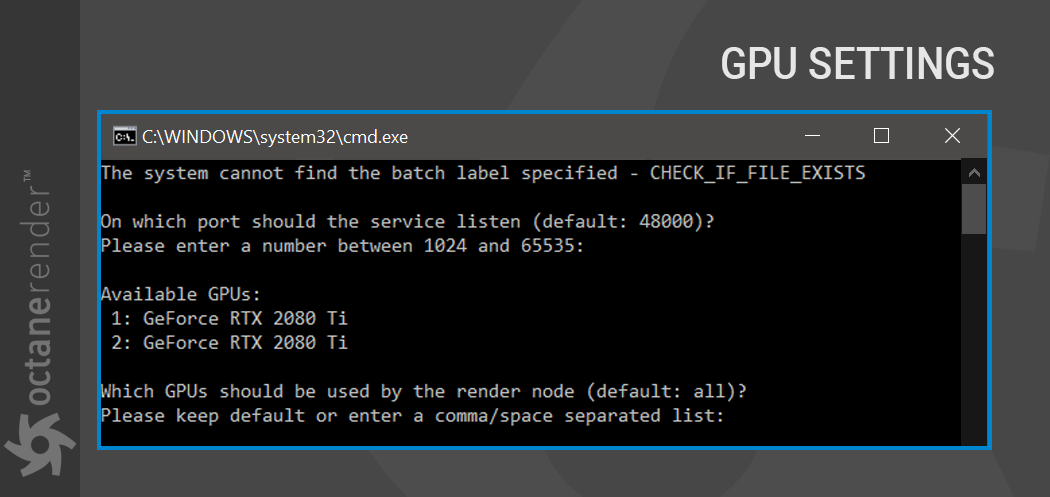 呈现渲染节点机器上的 GPU 列表并选择要使用的 GPU。例如,如果只需要 3 个 GPU 中的 2 个,只需输入以下行:"1, 2"(不带引号),或按 Enter 默认使用所有 GPU。