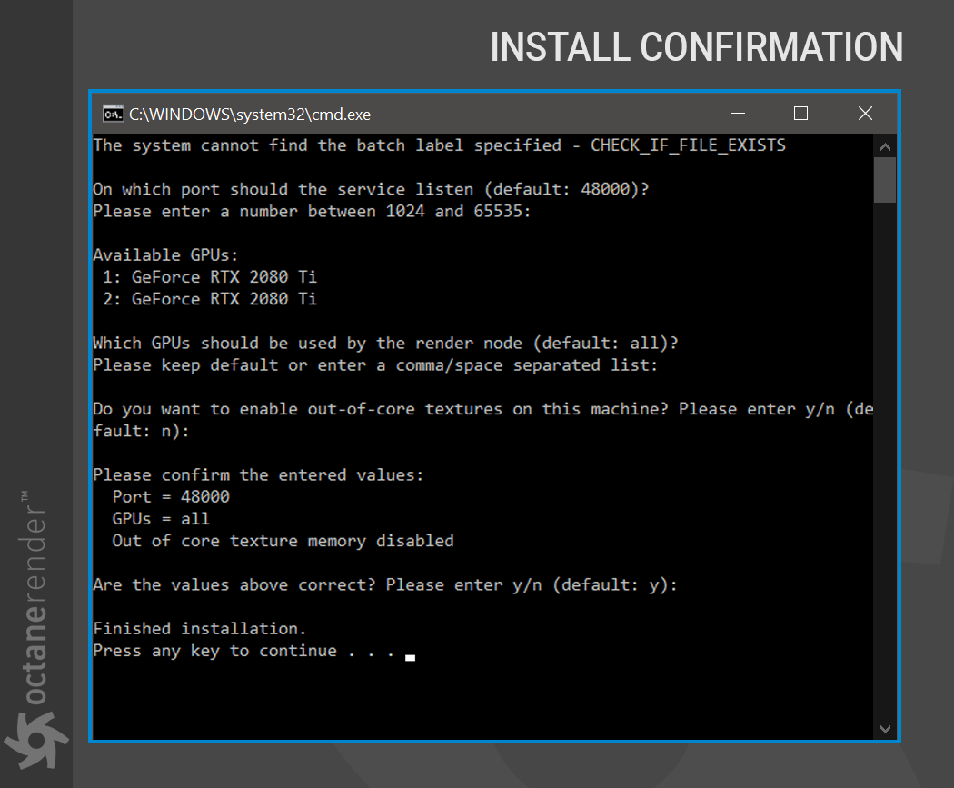 随后将出现确认文本。如果所有设置都正确,键入"y"以完成安装。按任意键退出命令行实用程序。