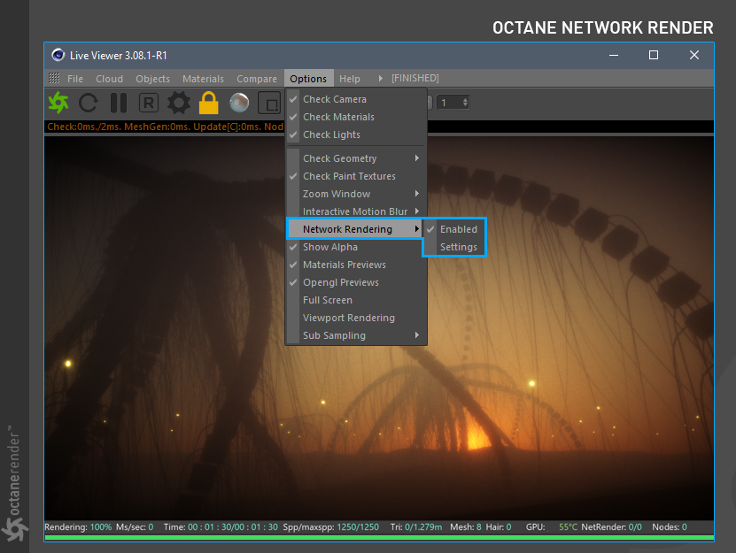 这完成了渲染节点机器的设置。现在是时候使用这些机器中的 GPU 进行渲染了。打开 Cinema 4D,上传任何项目,并启动实时查看器。从实时查看器菜单转到 选项 > 网络渲染 并选择 启用。然后转到设置。