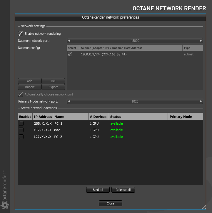 识别子网 IP 后,渲染节点机器列表将出现在"活动网络守护进程"中。状态列表中列为"可用"的机器已准备好进行网络渲染。启用所需的节点;将出现消息:"渲染节点正在运行"。或者,单击"绑定全部"以激活所有渲染节点机器。完成后,关闭网络窗口。现在是渲染的时候了。