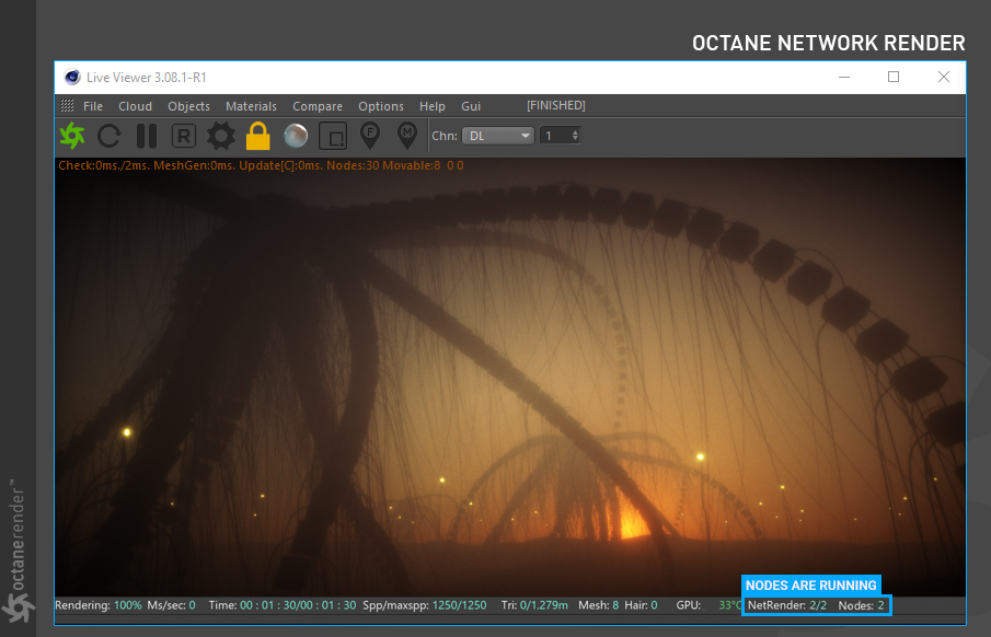 网络渲染需要 OctaneRender® Enterprise 和正确配置的网络,包括主节点和渲染节点机器(已安装 GPU 设备)。本节将讨论使用 Octane 内直接工具的简单网络渲染方法。本节不涉及使用第三方网络渲染控制器(如 Team Render 或 Deadline)。