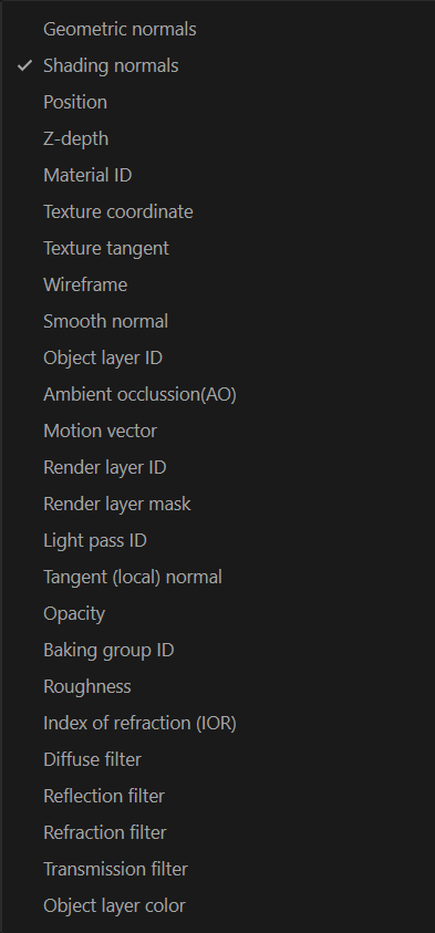 此菜单允许您指定可以渲染到 AOV 并在合成过程中使用的各种通道。通道定义如下: