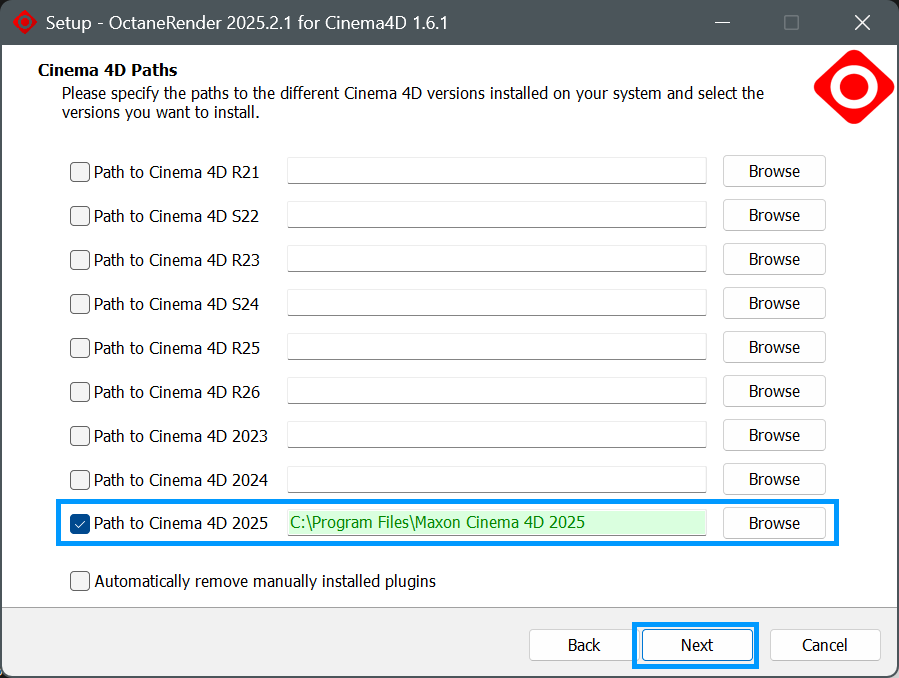 步骤 5: 路径屏幕现在将出现。根据需要,通过浏览器按钮选择所需的位置进行安装。如果您之前安装了 Octane 版本,它们将出现在路径列表中。您可以通过单击版本列表旁边的蓝色复选框切换来启用或禁用安装到特定的 Cinema 4D 版本。如果您尝试在较新版本之上安装较旧版本的 Octane,安装程序会警告您并要求确认继续。当一切如您所愿时,单击 下一步 继续。