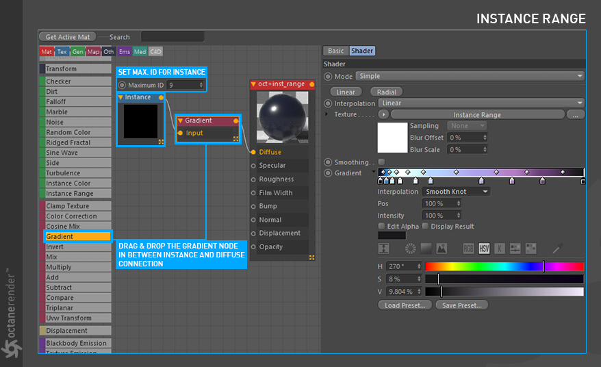 3- 接下来是材质和实例范围设置。使用之前教程中的材质创建设置。这次您将使用"渐变"节点。只需从左侧菜单拖动渐变节点,并将其放在"实例节点"和"漫反射材质"之间。节点会自动放置在它们之间。将实例节点最大 ID 设置为 9(因为我们有 9 个圆柱体对象)。按照您在下面的图像中看到的方式进行渐变设置,或使用您自己的渐变颜色。您可以从"加载预设"按钮中选择任何渐变模板。