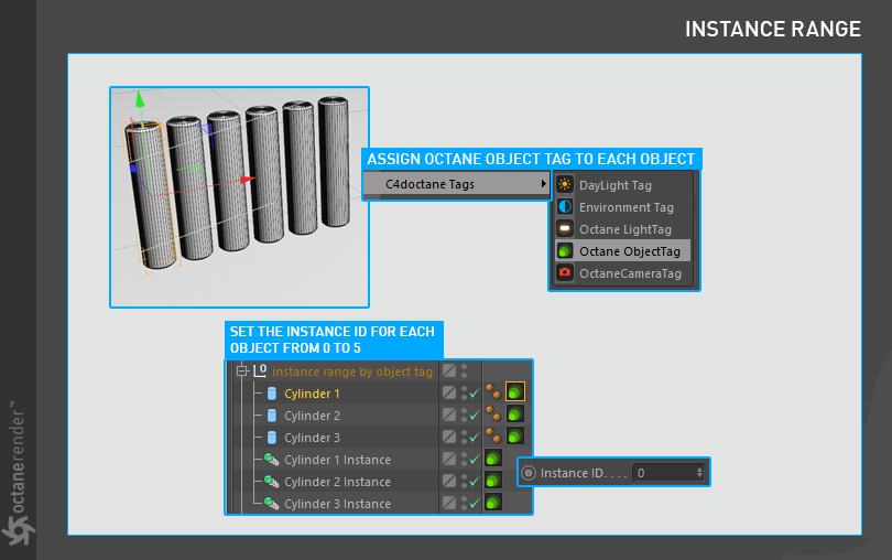 2- 现在我们将为每个圆柱体设置实例 ID。为此,在选择对象时右键单击"C4D Octane 标签"菜单,然后选择"Octane 对象标签"。然后转到对象标签中的"对象层",为每个圆柱体定义 0 到 5 的实例 ID。