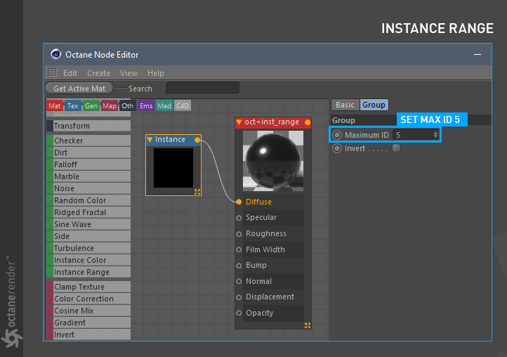 3- 接下来是材质和实例范围设置。使用之前教程中的材质创建设置,但这次您将使用"实例范围"节点。选择此节点时,在右侧选项的"最大 ID"字段中输入数字 5,并将材质分配给圆柱体组。