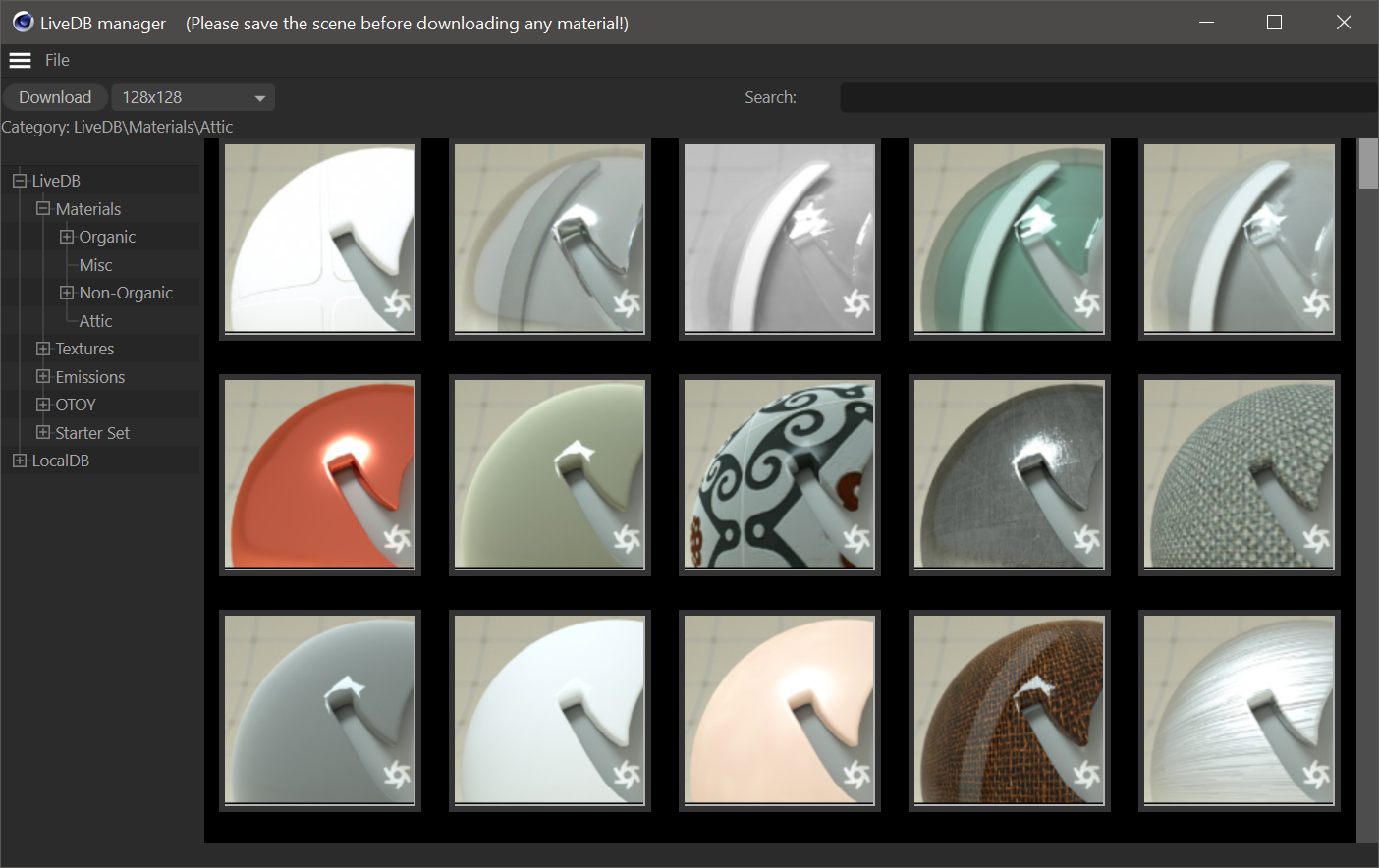 您需要使用 Octane 独立版 将材质上传到 LiveDB。为此,将场景导出为 ORBX 文件,并在 Octane 独立版中打开场景,如 这里 所述。