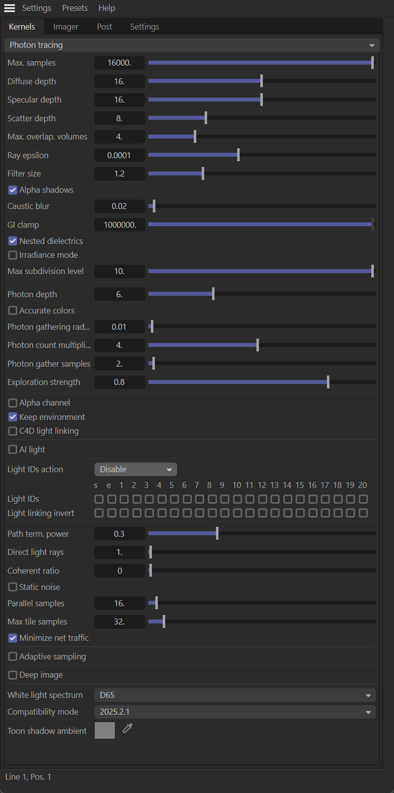 内核标签是您可以设置在实时查看器中用于渲染的渲染内核以及每个内核的相关设置的地方。渲染内核是基于您的灯光、材质和场景资产创建图像的核心渲染算法。OctaneRender 中有四个渲染内核,每个内核最适合特定功能,简要总结如下: